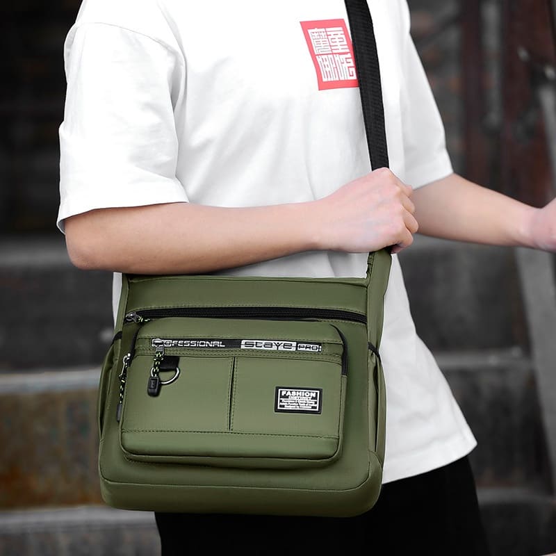 Tas selempang berbahan nylon premium dengan lapisan tahan air, kapasitasnya luas dan banyak sekat penyimpanan.
