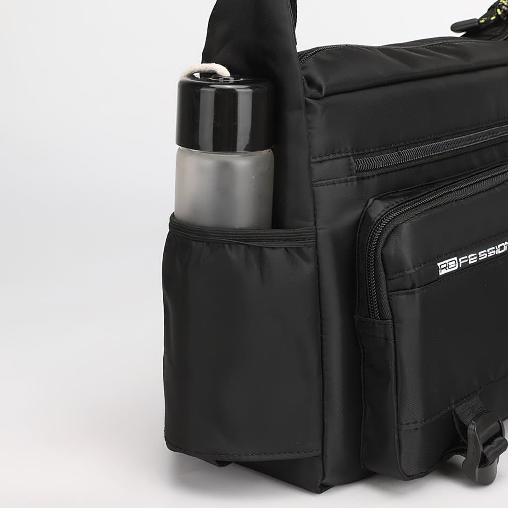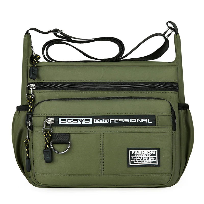 Tas selempang berbahan nylon premium dengan lapisan tahan air, kapasitasnya luas dan banyak sekat penyimpanan.